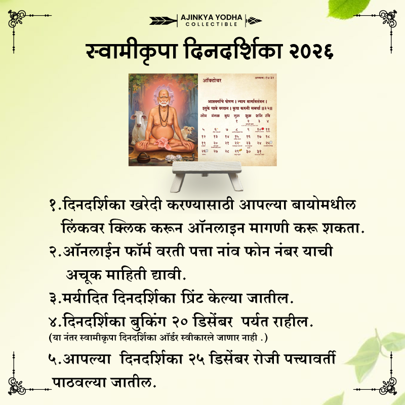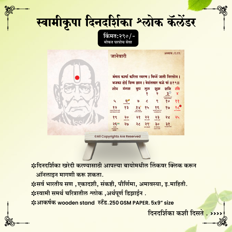 तुमच्या दररोजच्या जीवनात परमपूज्य स्वामी समर्थांचे आशीर्वाद आणि ज्ञान आणण्यासाठी ‘स्वामीकृपा दिनदर्शिका २०२६’ सादर करत आहोत. हे केवळ कॅलेंडर नाही, तर स्वामींच्या चरित्रातील प्रेरणादायी श्लोक, अर्थपूर्ण डिझाइन आणि अचूक धार्मिक माहितीचा संग्रह आहे.