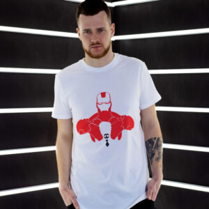 Unleash your inner hero with our Iron Visage tee. Featuring a bold red silhouette that echoes the iconic armor of a legendary superhero,